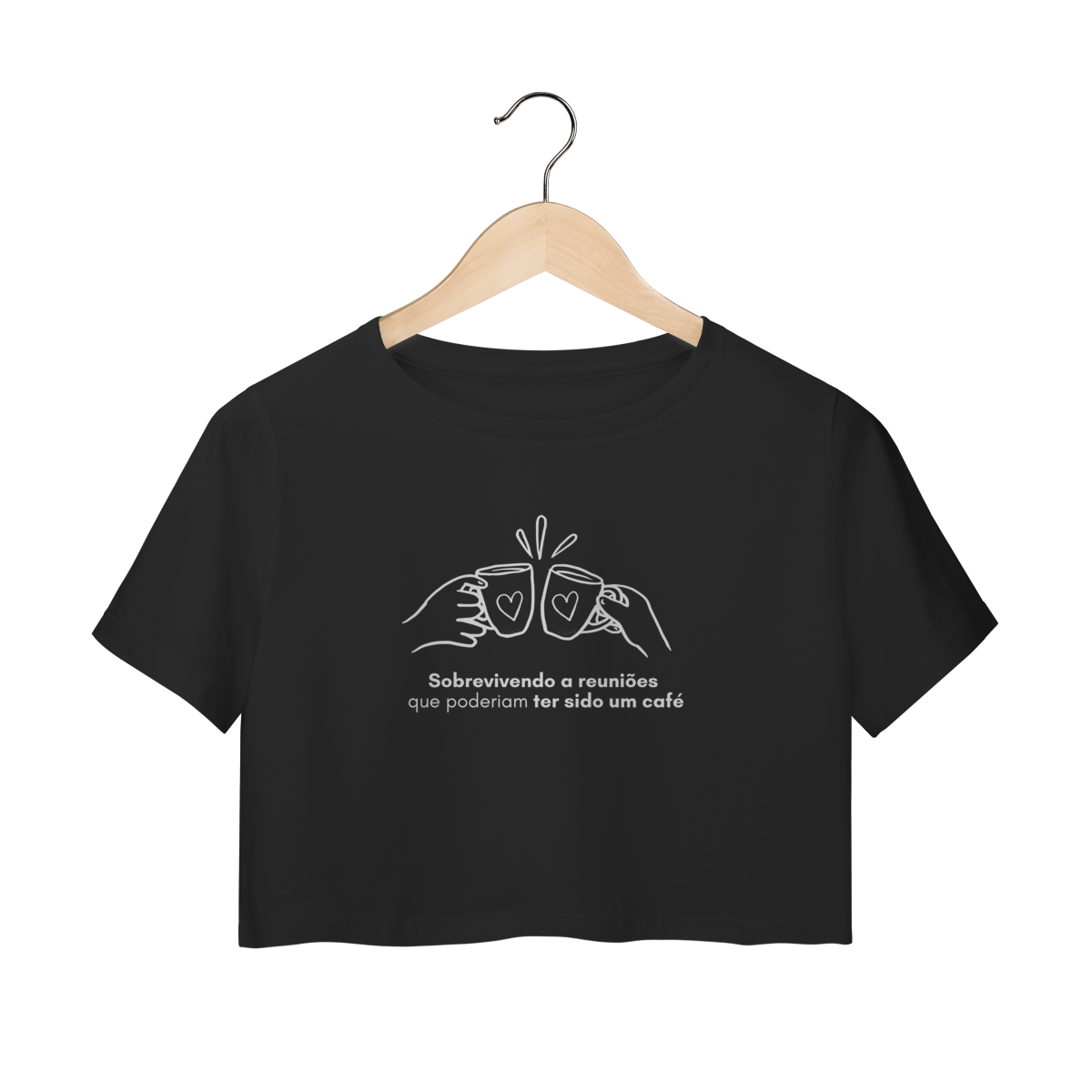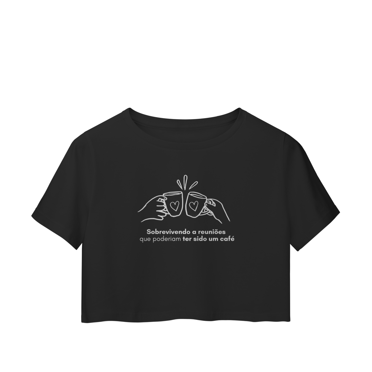 Para a empreendedora que já participou de reuniões intermináveis, quando um café honesto teria resolvido tudo em 10 minutos. O Cropped Surto & Café traz uma ilustração minimalista de duas canecas brindando e a frase “Sobrevivendo a reuniões que poderiam ter sido um café”, perfeita para quem vive entre calls, planejamentos e brainstorms que não acabam nunca.